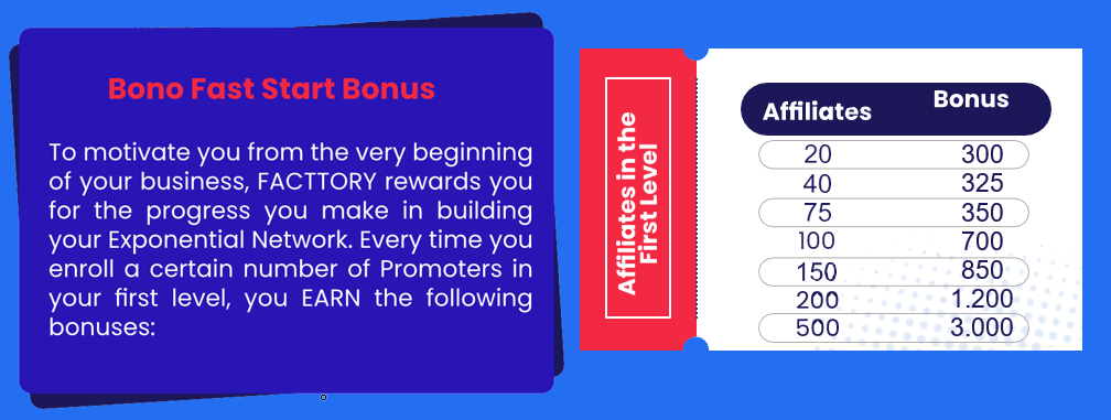 With the aim of motivating you to quickly build your Exponential Network, FACTTORY rewards you for the progress you make in the evolution of your work team, therefore by completing a certain number of Promoters in your Second Level, YOU EARN THE FOLLOWING BONUSES: